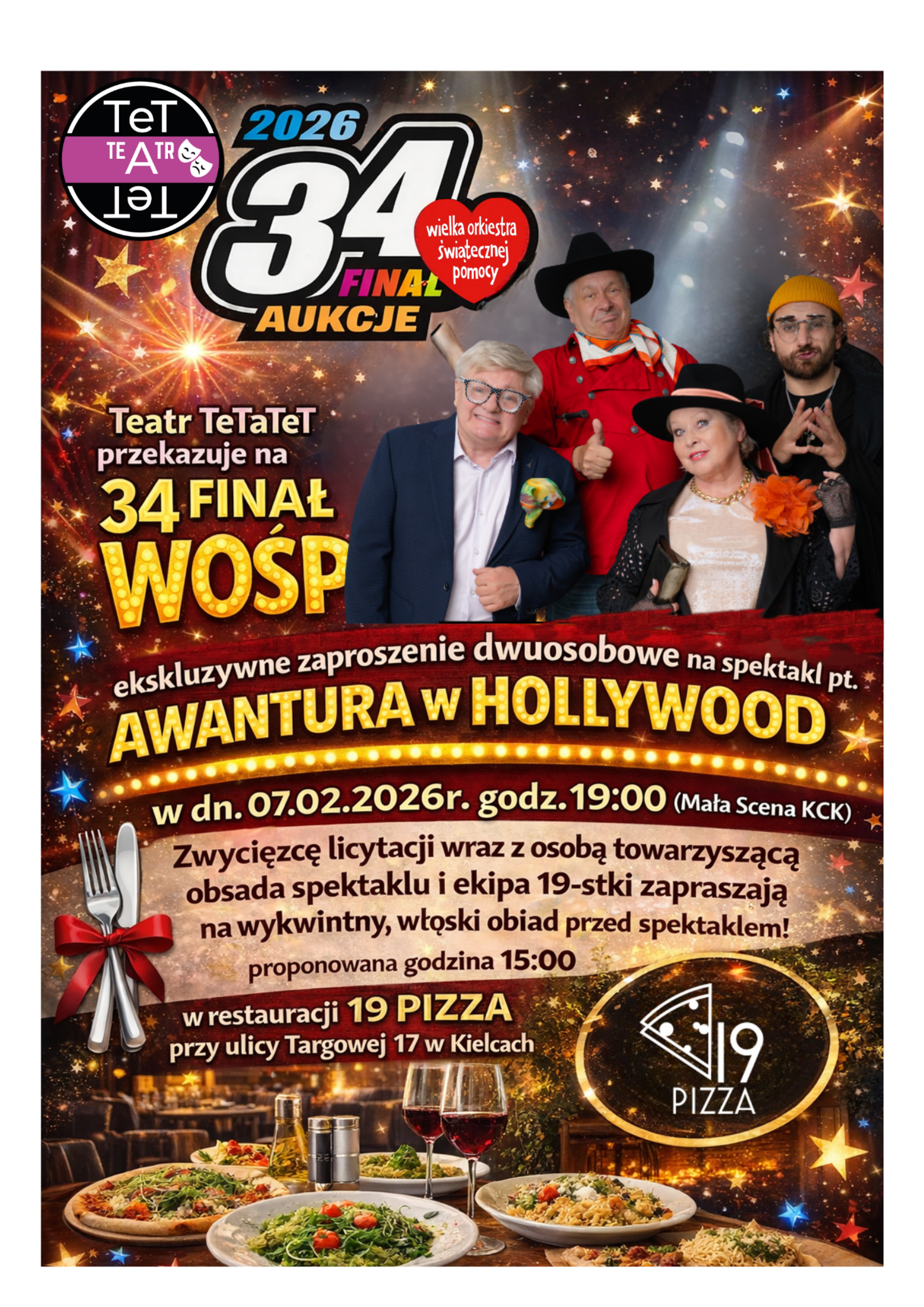 Dwuosobowe zaproszenie na spektakl komediowy „Awantura w Hollywood” od Teatru TeTaTeT + włoski obiadCena sprzedaży: 500.00 złIndeks: 303/26Numer na licytacji: 1Licytacja: 2026-01-25 17:00 - Dom Środowisk Twórczych Pałac T. Zielińskiego |
