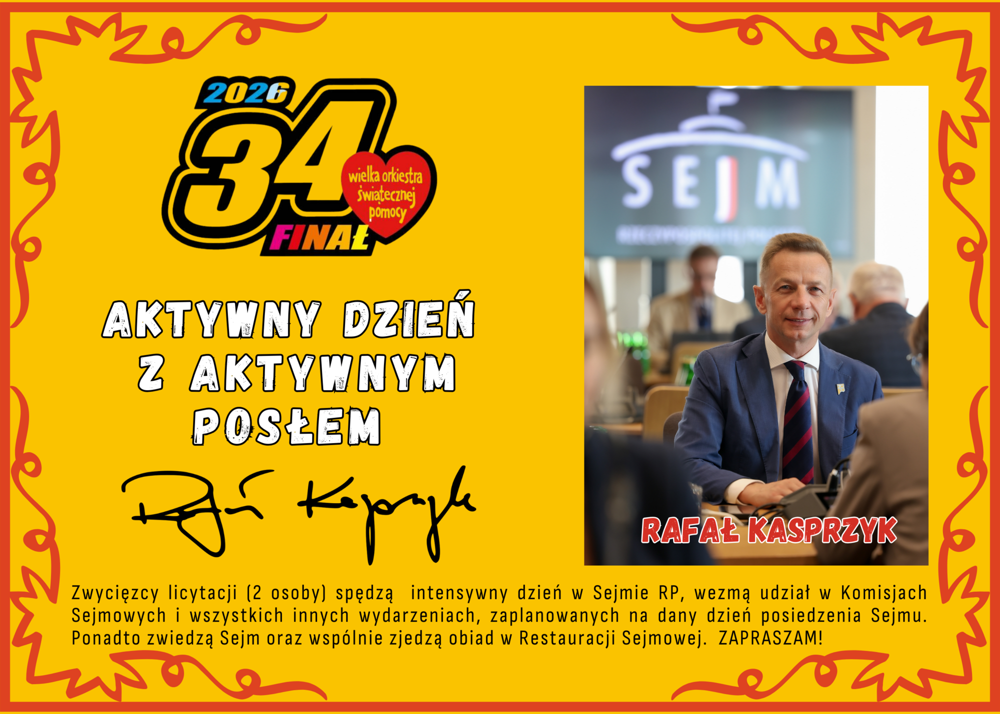 Aktywny dzień z aktywnym posłemCena sprzedaży: 1 100.00 złIndeks: 274/26Numer na licytacji: 79Licytacja: 2026-01-25 17:00 - Dom Środowisk Twórczych Pałac T. Zielińskiego |