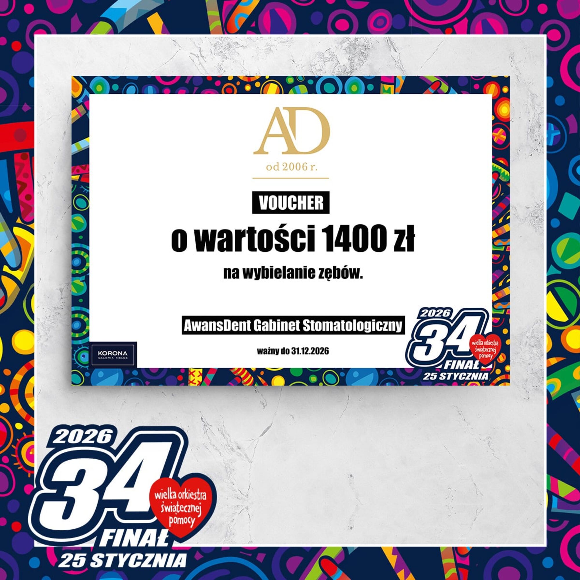 Voucher na wybielanie zębów o wartości 1.400 złotych od AwansDentCena wywoławcza: 0.00 złIndeks: 101/26Numer na licytacji: 0Licytacja: 2026-01-25 10:00 - Galerie: ECHO i KORONA |