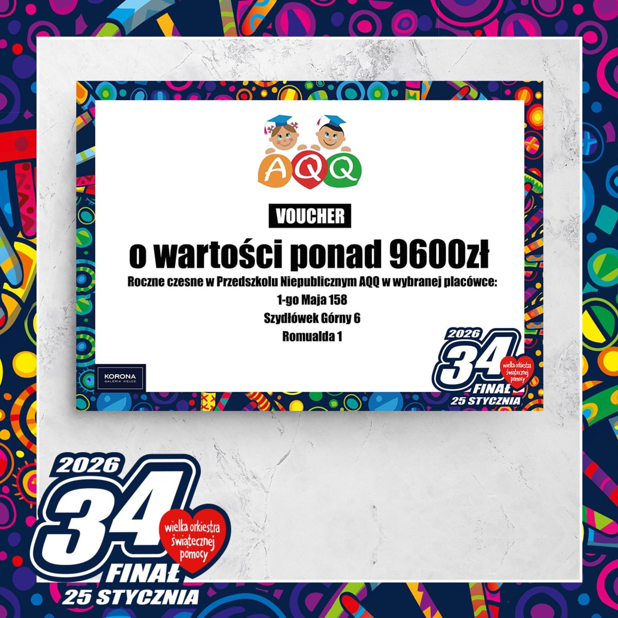 Voucher 9.600 zł na roczne czesne w Przedszkolu AQQCena wywoławcza: 0.00 złIndeks: 184/26Numer na licytacji: 0Licytacja: 2026-01-25 10:00 - Galerie: ECHO i KORONA |