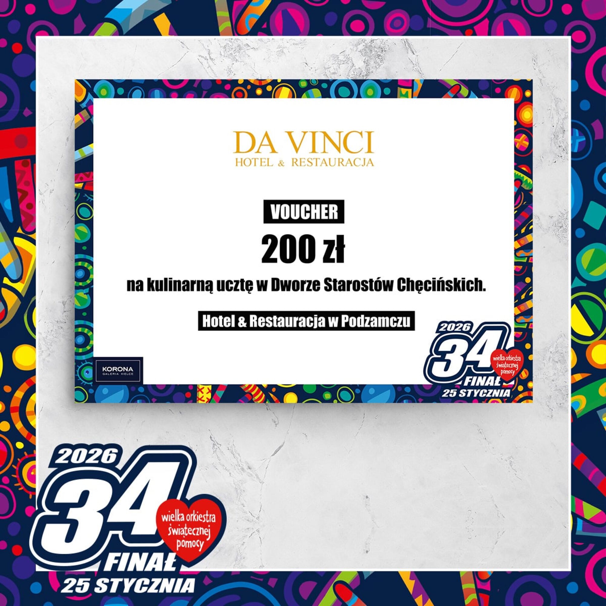 Voucher 200 zł na ucztę w Dworze Starostów ChęcińskichCena wywoławcza: 0.00 złIndeks: 10/26Numer na licytacji: 0Licytacja: 2026-01-25 10:00 - Galerie: ECHO i KORONA |