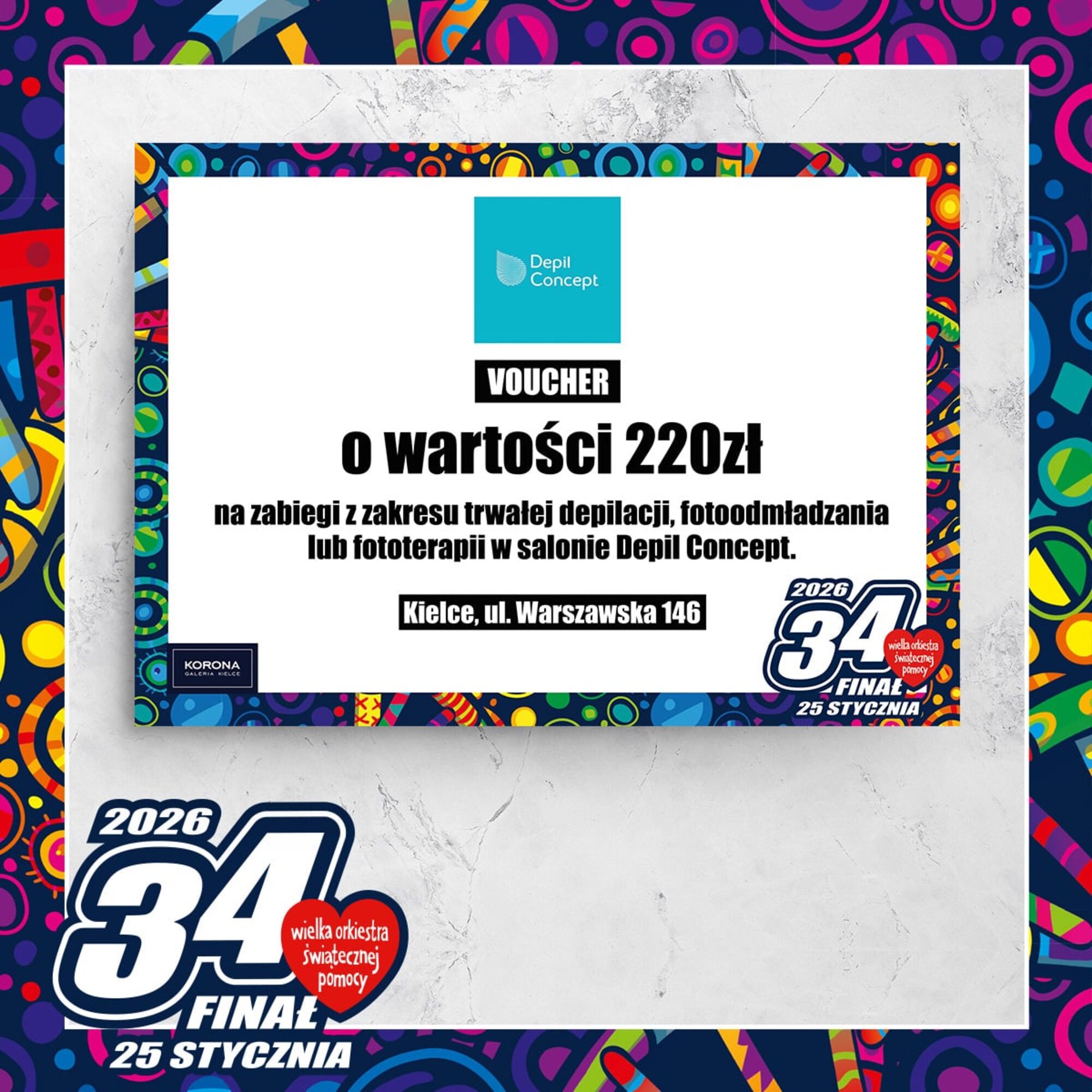 Voucher o wartości 220 zł od Depil ConceptCena wywoławcza: 0.00 złIndeks: 53/26Numer na licytacji: 0Licytacja: 2026-01-25 10:00 - Galerie: ECHO i KORONA |