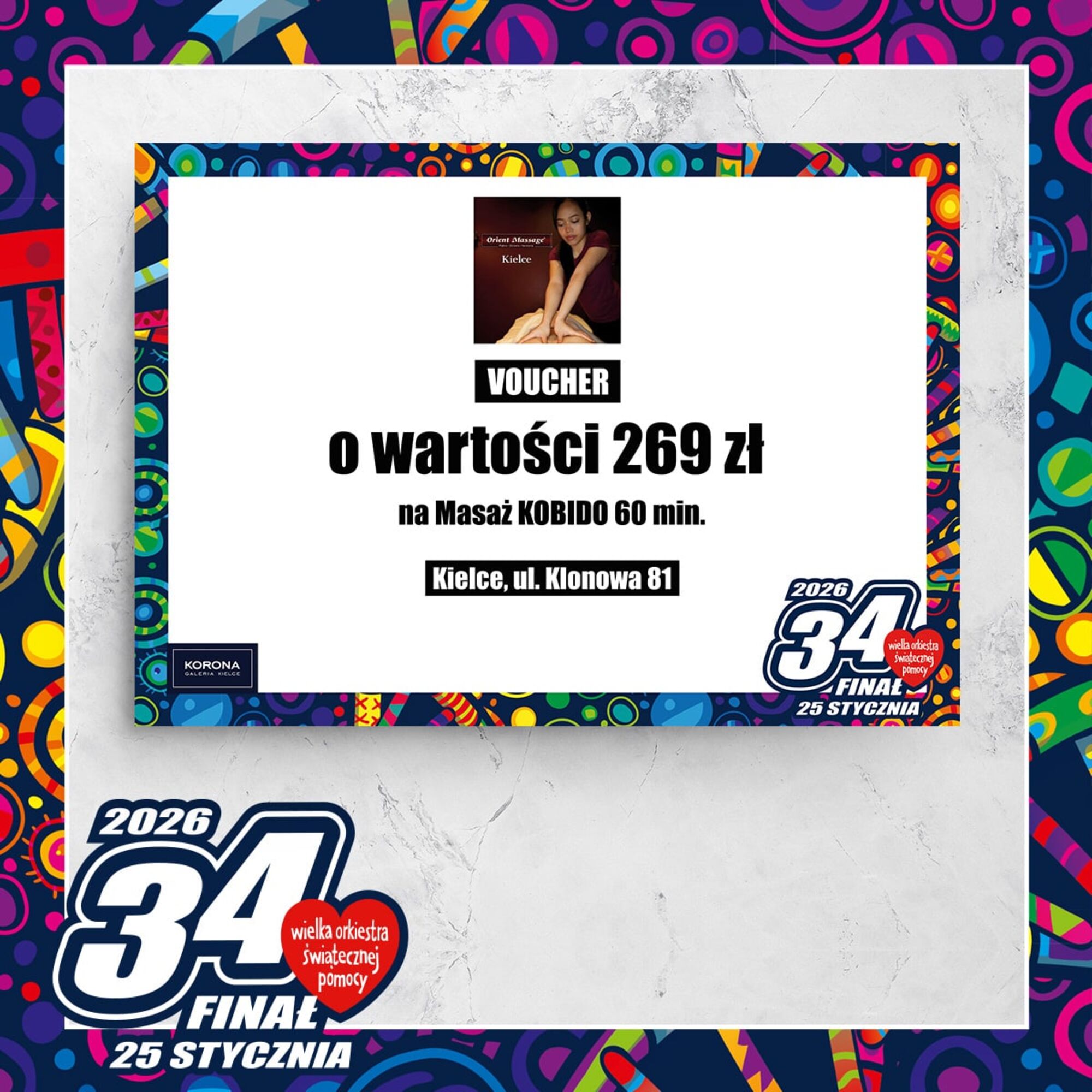 Voucher na Masaż KOBIDOCena wywoławcza: 0.00 złIndeks: 31/26Numer na licytacji: 0Licytacja: 2026-01-25 10:00 - Galerie: ECHO i KORONA |