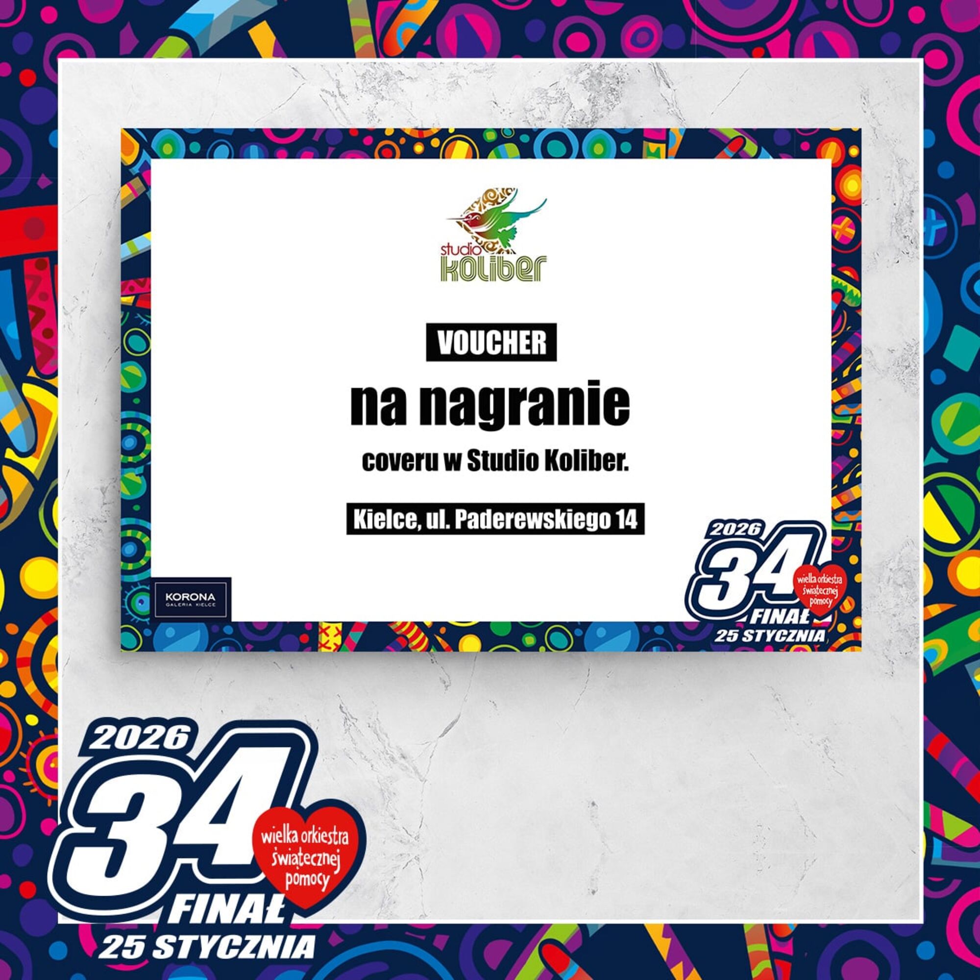 Voucher na nagranie w Studio KOLIBERCena wywoławcza: 0.00 złIndeks: 13/26Numer na licytacji: 0Licytacja: 2026-01-25 10:00 - Galerie: ECHO i KORONA |